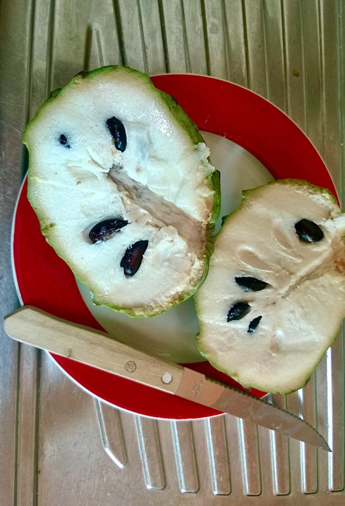 We brought it home and cut it open to enjoy with our very Aussie breakfast: fresh eggs from the backyard and toast with a generous swipe of Vegemite (because when in Rome… or Melbourne). The custard apple was dark green, bumpy, and kind of odd-looking. The rind was thick like a squash, and inside, the pale yellow flesh was soft but firm, speckled with big black seeds.
